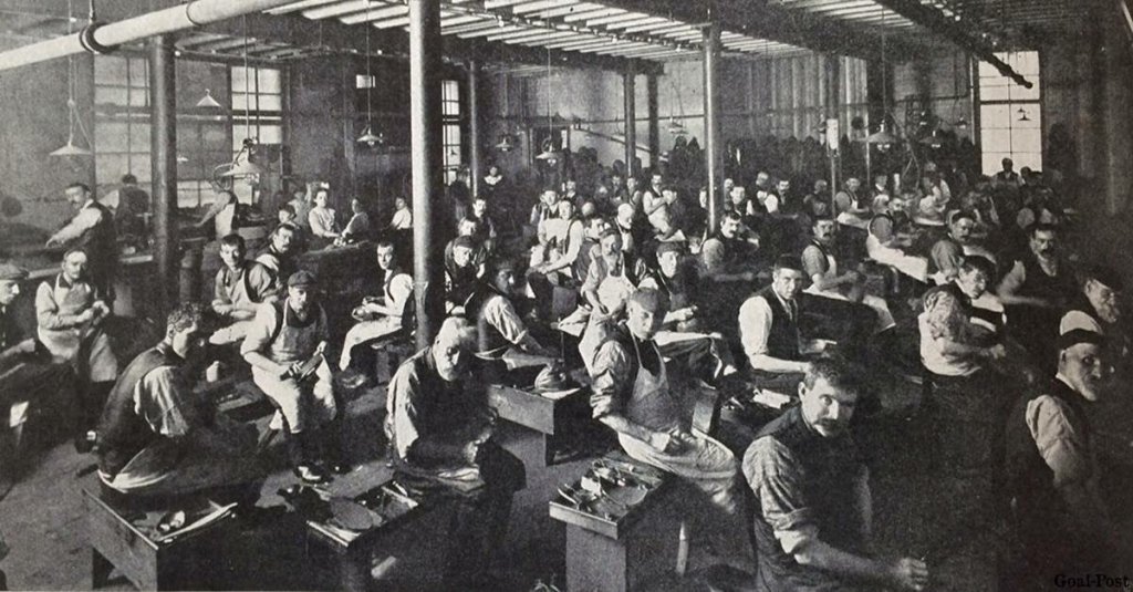 Arguably the mass-production of footballs started around the time when the English Football League was first established in 1888. Two of the most important football manufacturers in Britain for many years were Thomlinson’s of Glasgow and Mitre of Huddersfield. Before the advent of modern balls it was Tomlinson’s “T” ball which was one of the most famous balls in the country. The “T” ball was made at the Greenbank Leather Works in Glasgow, a factory which saw football craftsmanship at its best.